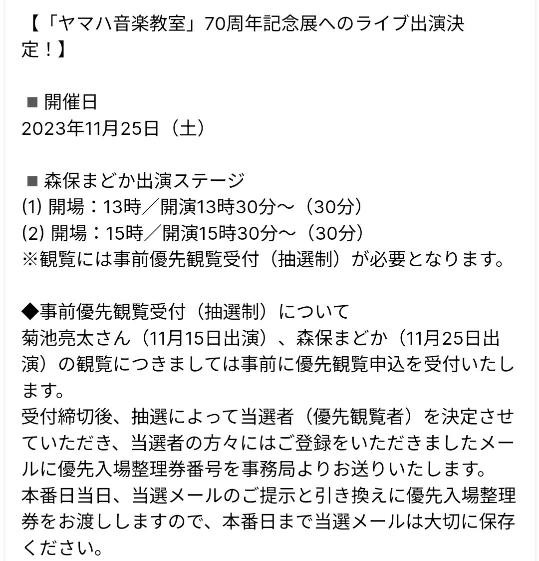 【森保まどか】「ヤマハ音楽教室」70周年記念展への ライブ出演が決定