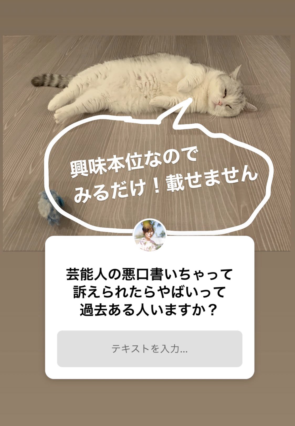 半分の方からは励ましや心配の声、もう半分の方からは「晒さないって言ったのに!」や「載せないって言ってたのに載せてることをまず謝れ」という内容のメッセージが届いていました。なぜかというと、その質問に私が「興味本位なのでみるだけ!載せません」と→