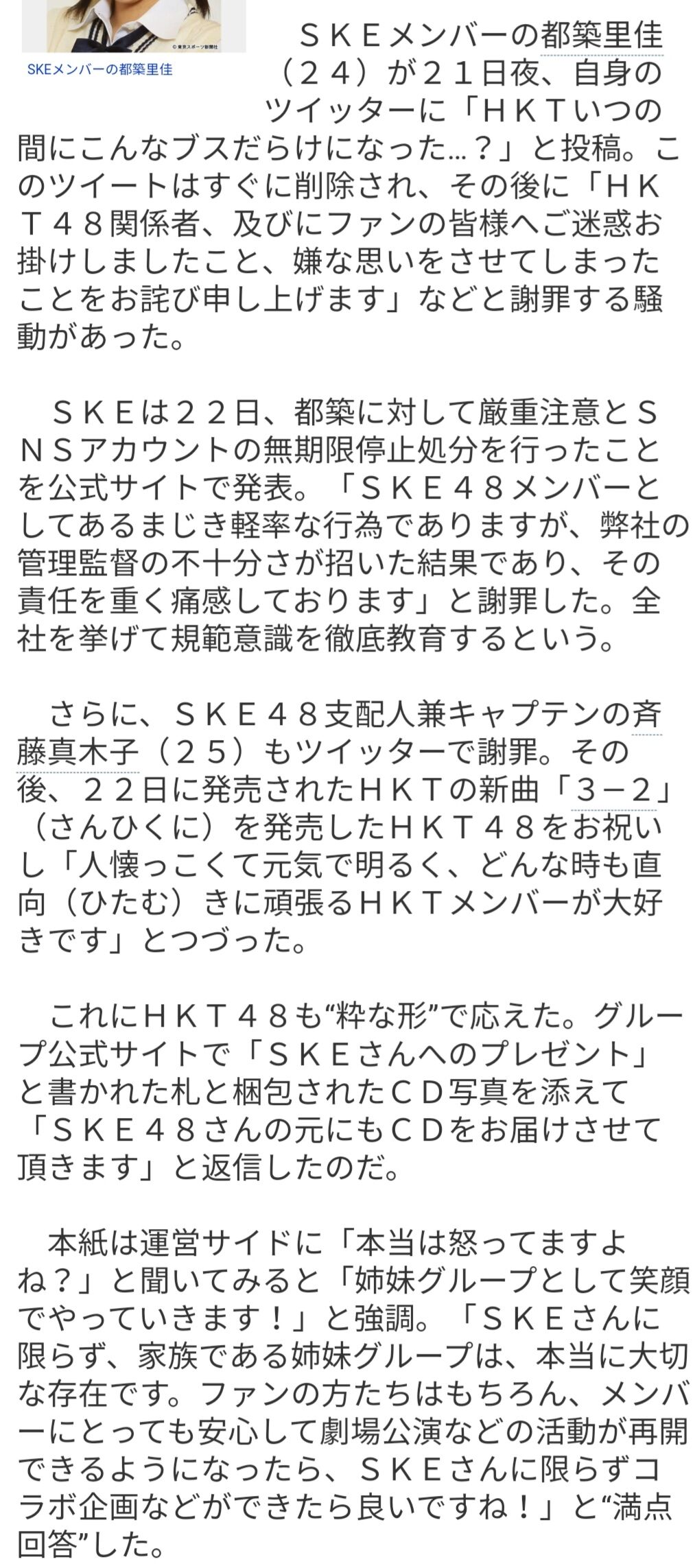 東スポ「本当は怒ってますよね?」 HKT運営「姉妹グループとして笑顔でやっていきます!家族である姉妹グループは大切な存在です」w